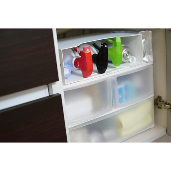 根本美穂さんは、引き出しとファイルケースを合わせて使っています。引き出しはざっくりと分類して収納し、スプレー類はファイルケースを横置きに収納しているのだとか。化粧道具などは洗面台に付属した引き出しを使って、メイクをするとき引き出したまま使えるのがとても便利なのだそうです。