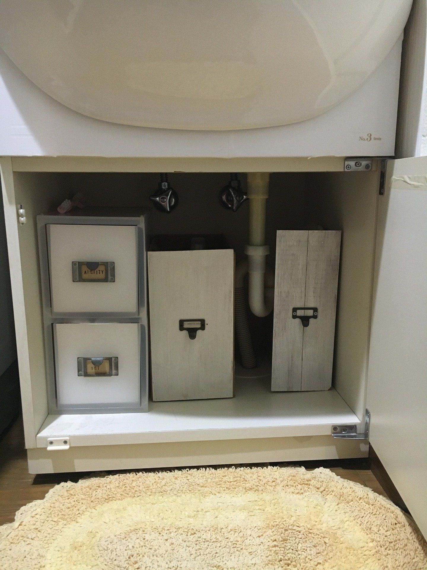 洗面台下にも、見た目の統一感を重視するHitomiさんは、配管をよけながら創意工夫の収納をしています。タテ長の2つのケースは、ダンボールとファイルケース、それぞれの外側をベニヤ板で加工したもの。洗面所やお風呂場で使うストックや、体重計などもスッキリおさまり、じょうぶでサイズ感もいいそうです。