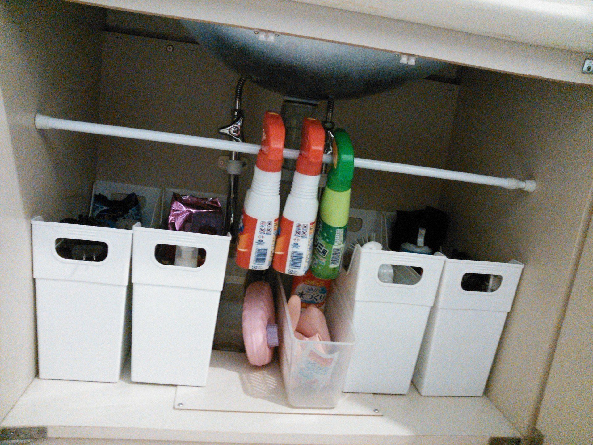 これまで洗面台下の収納は、ものを入れているかごのサイズ形もバラバラで、ムダなスペースが多かったという、ようちゃんぽんさん。真ん中の配管を避け、左右には100均で購入したファイルケースを置き、スプレー類を引っかけるためにつっぱり棒を使うことに。配管分のスペースもカバーでき、かなりスッキリしたそうです。