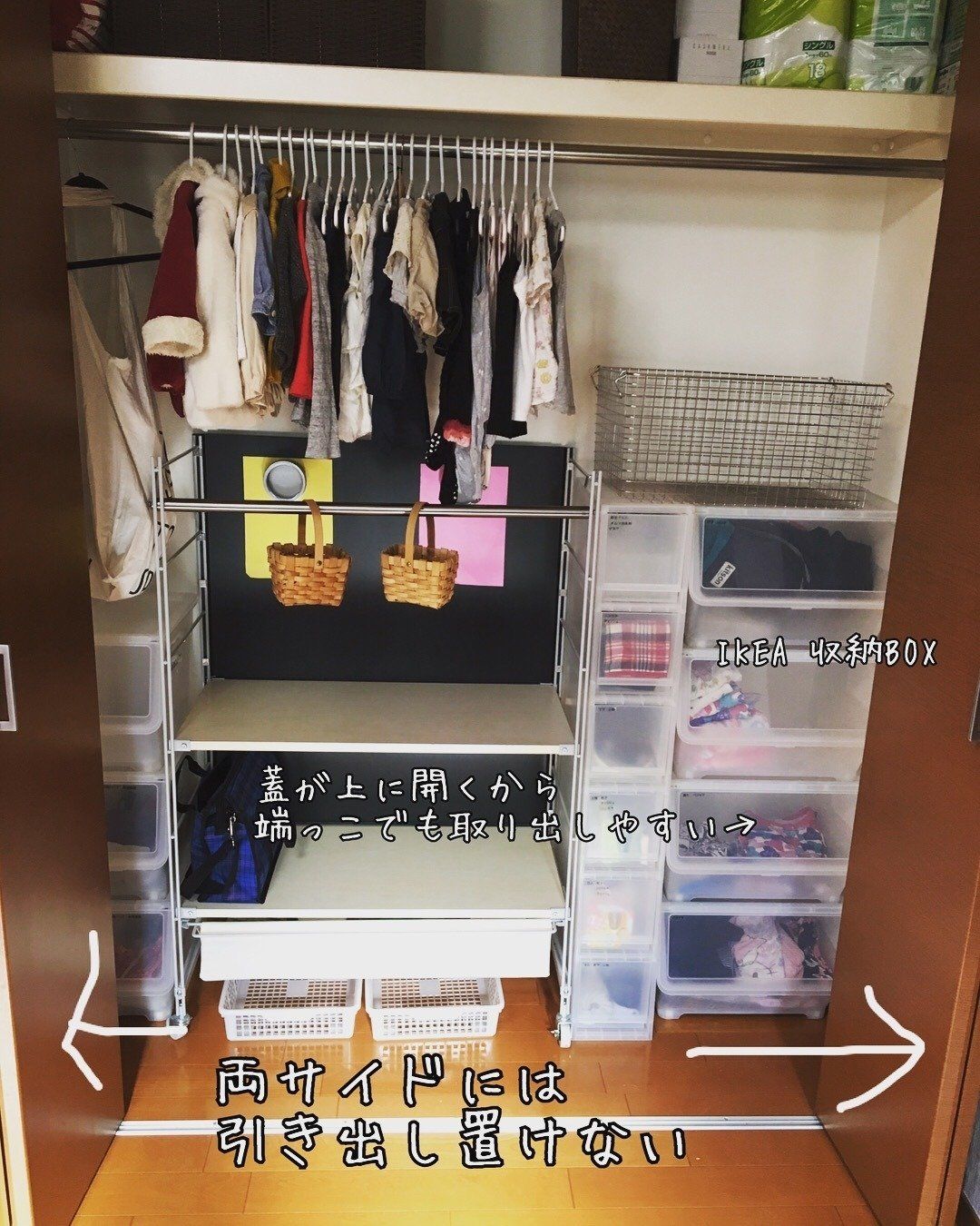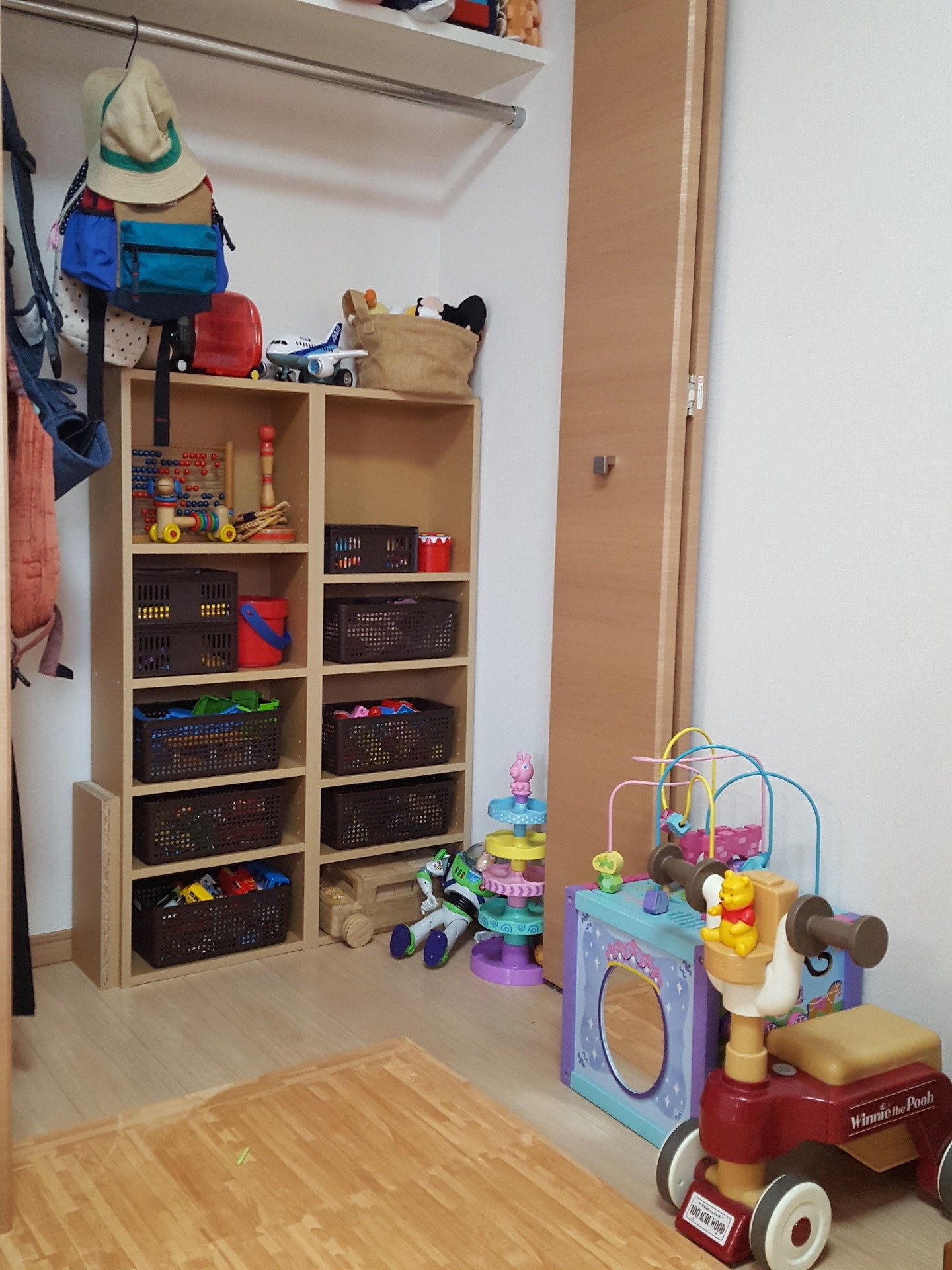 オモチャ類の収納にクローゼットを活用しているJUMIJUMIさん。無印良品のパルプボードボックス2つを、子ども部屋のクローゼット内に設置しました。アイテムに合わせて仕切り板の高さを変え、ピッタリサイズの100均のカゴにオモチャを種類別に収納したそうです。扉をしめれば急な来客にもすぐに対応できますね!