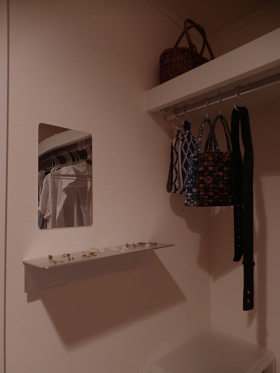 壁に、貼れるミラーと無印良品のアルミ製棚を使い、クローゼット内にオシャレ空間をつくった藤原絵美子さん。洗面所でピアスの着脱をすると紛失の可能性があるので、この鏡台スペースでピアスをつけたり、髪型をチェックしたりするようにしているんだとか。一軍のアクセサリーが並び、乙女心くすぐるできばえに大満足の藤原絵美子さんです。