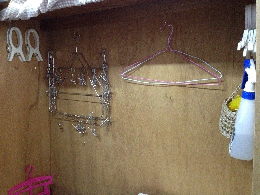 いつも寝室で洗濯ものを干すHitomiさん。寝室のクローゼットにランドリーセットを収納していますが、つっぱり棒を使うと場所をとり、見た目も悪いのが難点でした。そこで100均のL字ビスを使い、壁面につるすことに。仕上げにカーテンで目かくしをすれば、カラフルなハンガーの色も気にならず、見た目もスッキリしたようです。