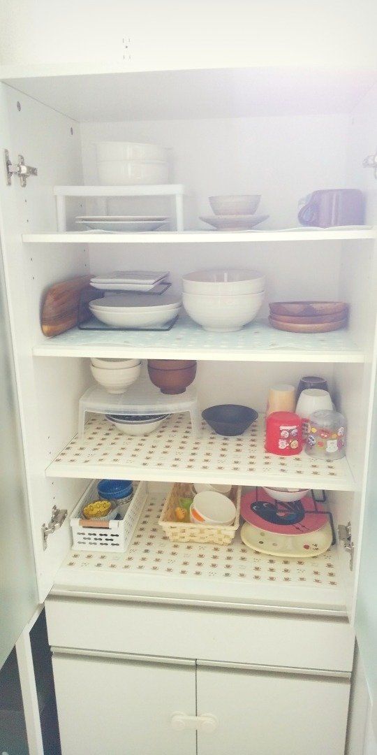 幸愛mamaさんは、コの字ラックやカゴを使って食器棚を整頓しているようです。コの字ラックを使うことで食器を種類別に収納できるようになり、しまうときも楽になったようですよ。子ども用の食器や小鉢など収納が難しい小さなものは、カゴにわけることで取りやすくなり、見た目もすっきりしたといいます。