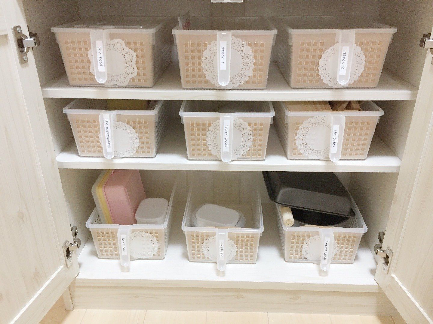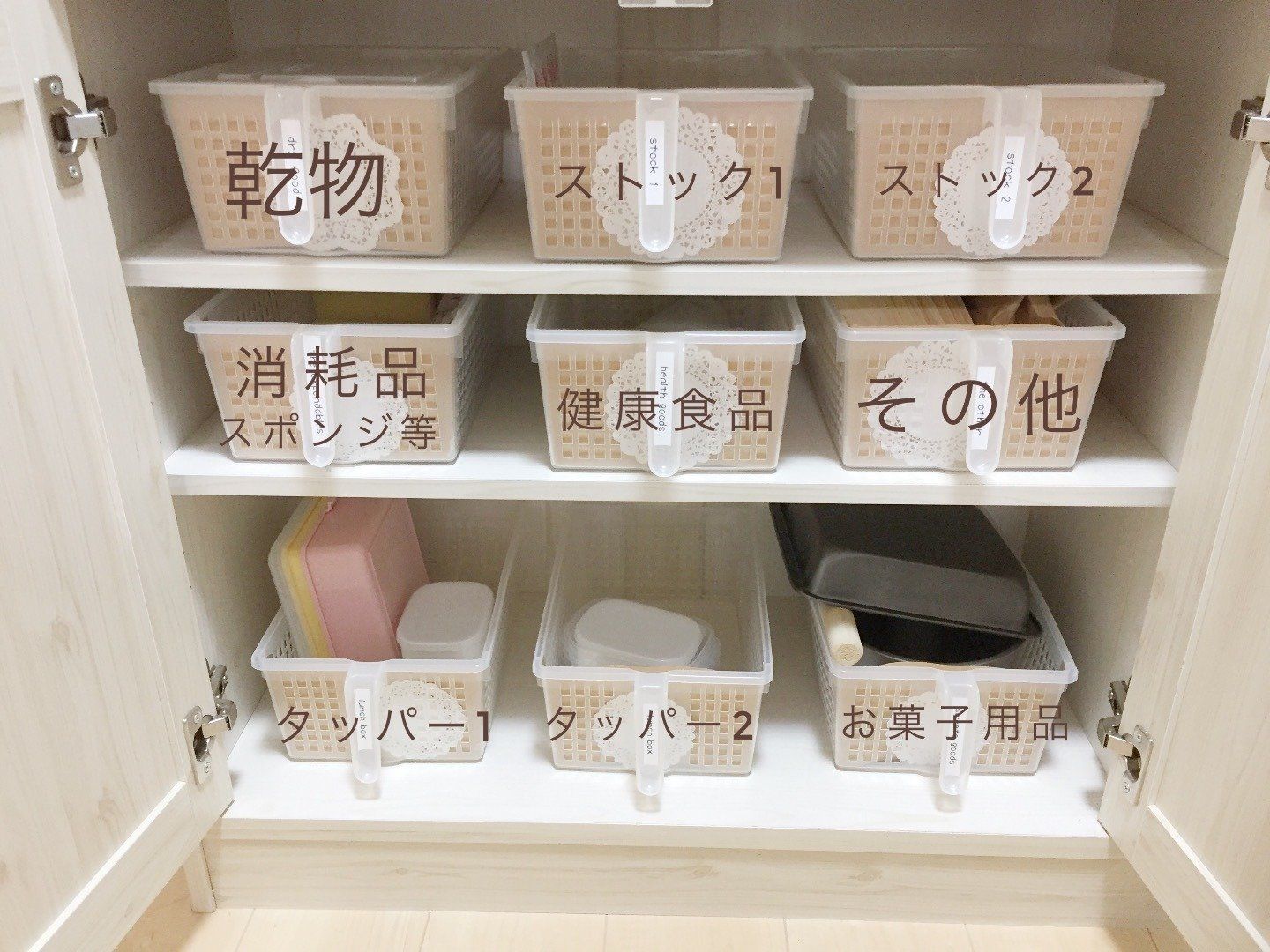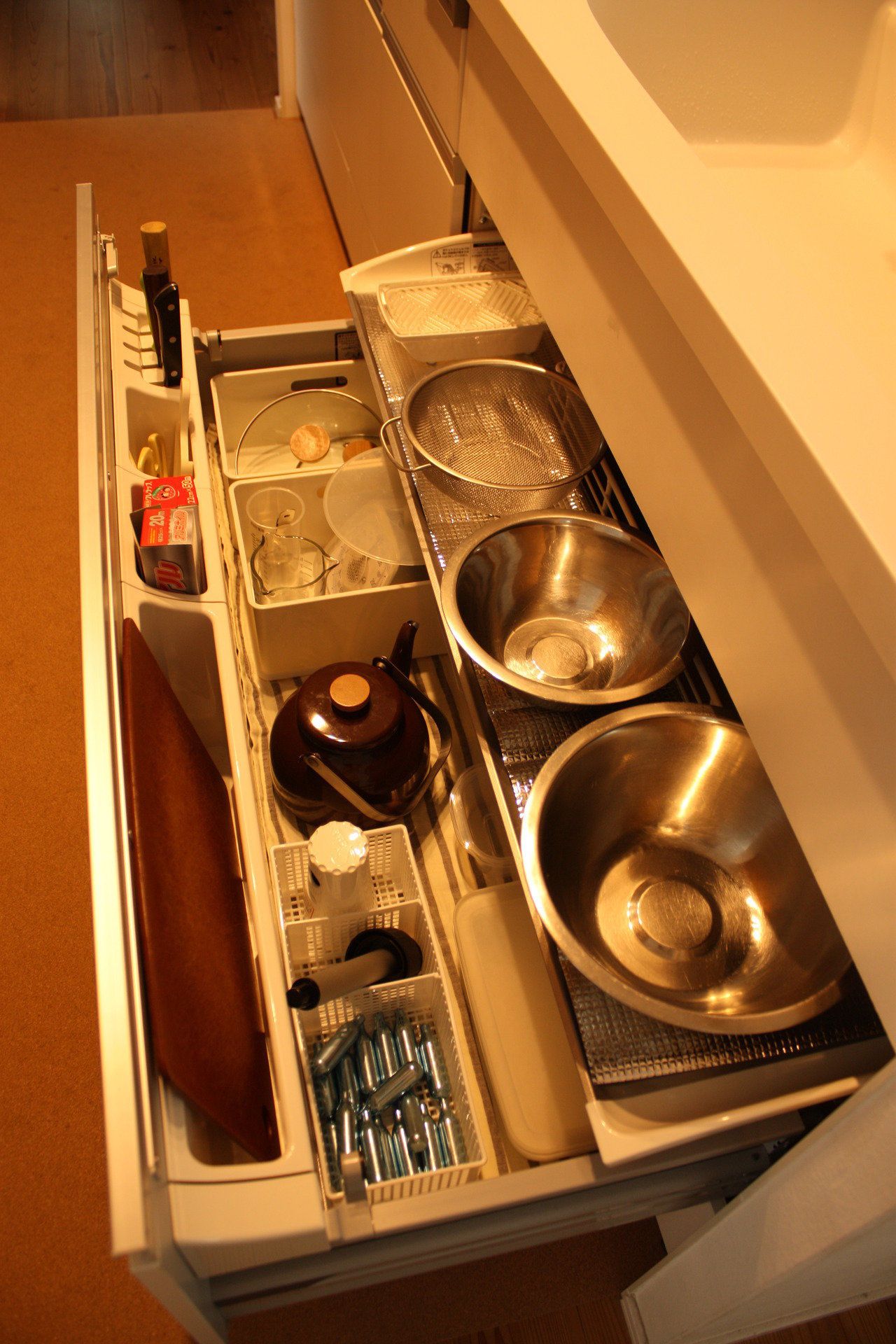 森田法子さんはキッチン用具をカゴで管理しているようです。用途別に区切ることで、どこに収納するべきか混乱してしまうことを防いでいるのだとか。カゴに収まる範囲ならぐちゃぐちゃに放り込んでもOKというルールで収納をより簡単に!容器内に収まる量が管理できる量だと意識することで、買いすぎも防げそうですね。