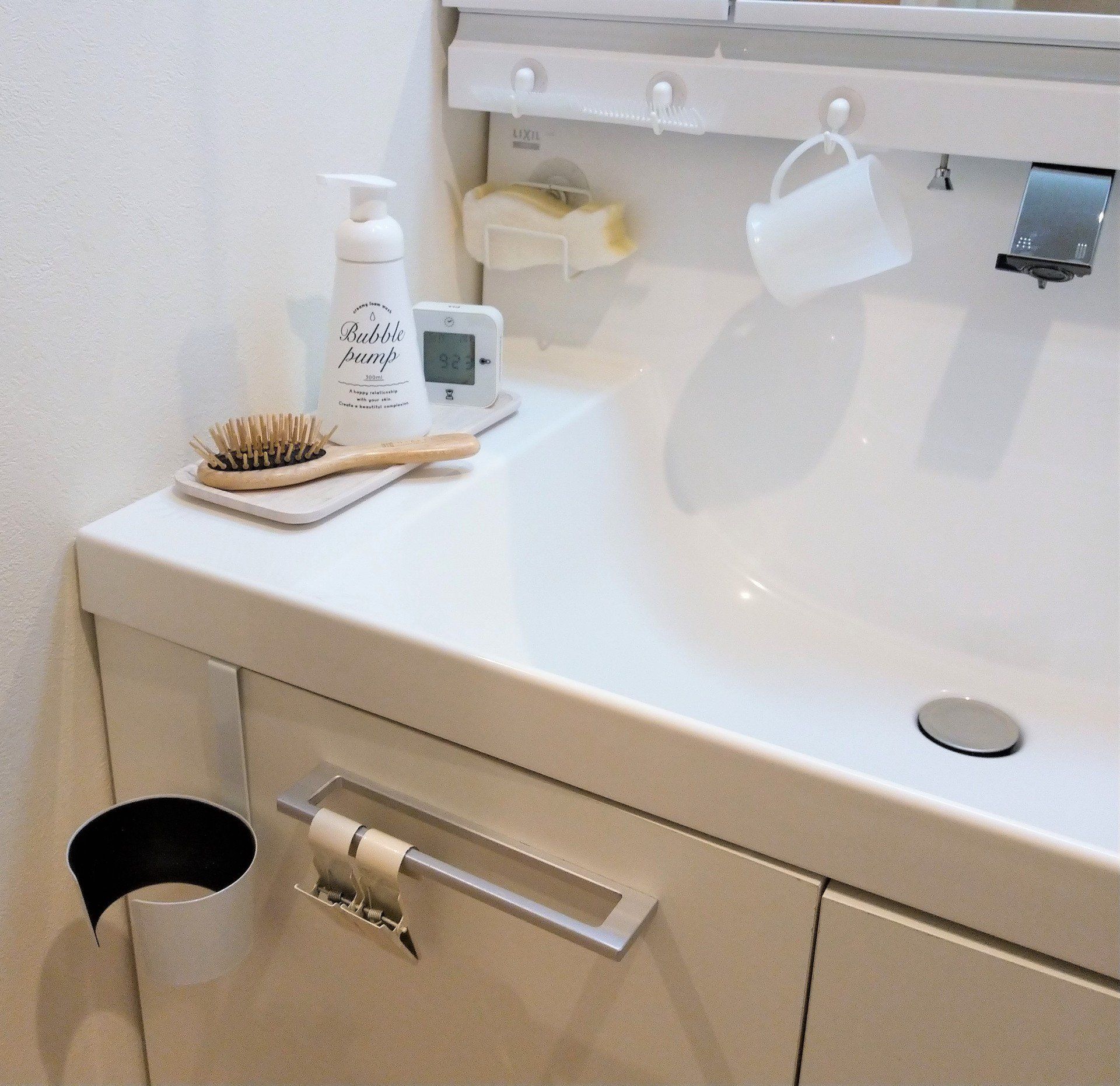 ひっかけ収納と白い小物でスッキリ洗面所