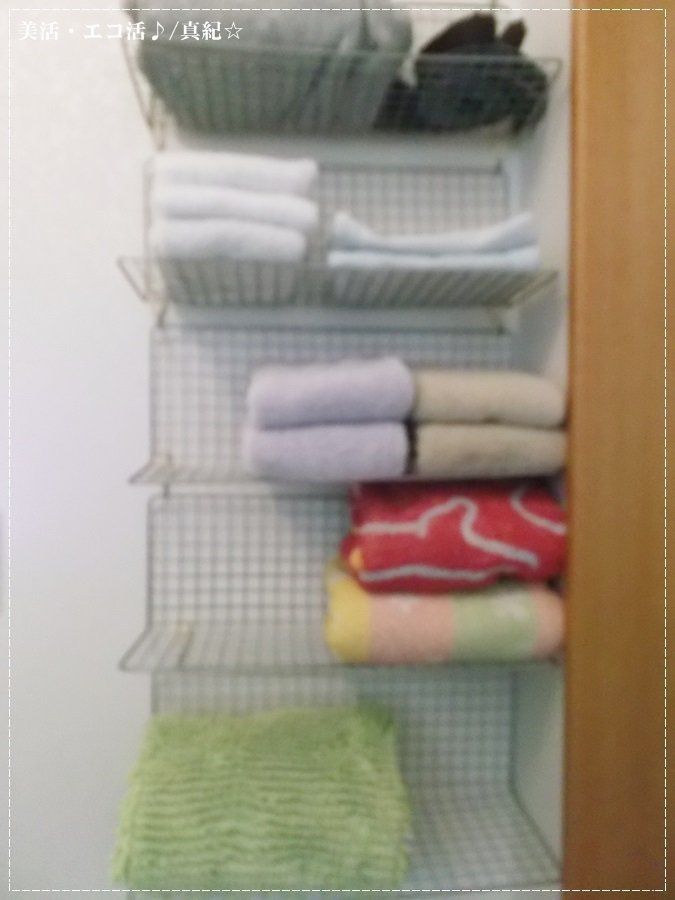 意外なアイテムを使って洗面所スペースを整理しているのが、真紀☆さんです。バスタオルを収納しているこちらの棚、じつは100均で購入したバーベキュー網でつくったもの。網を5枚も折り曲げ、同じく100均の引っかけフックでつなげているそう。せまいスペースを有効活用する、見える収納でした。