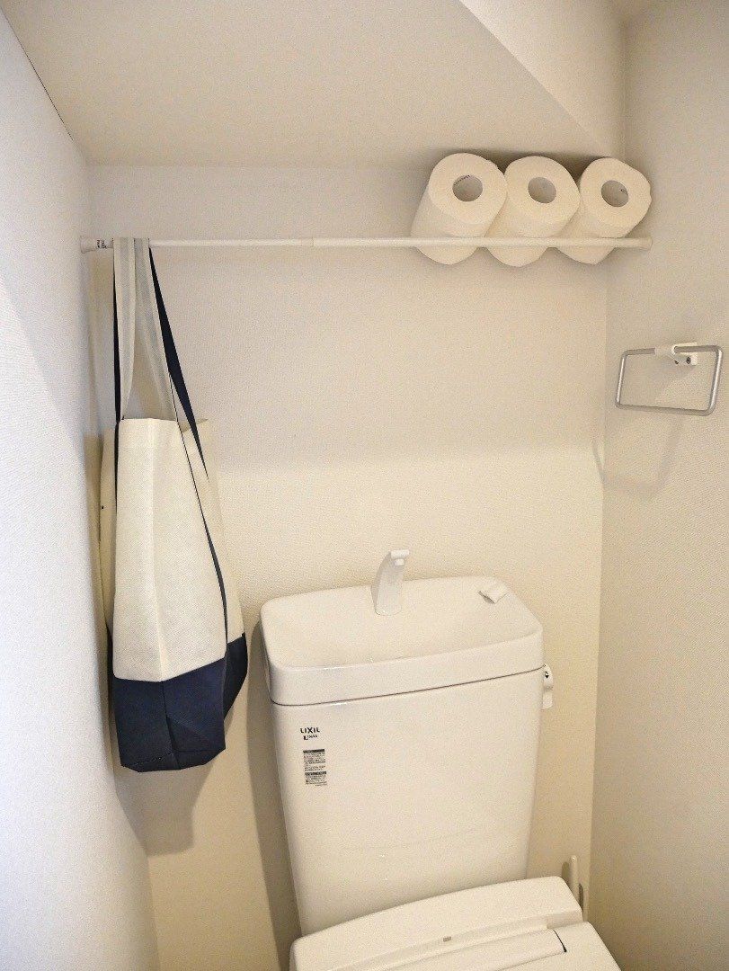 あっちゃんさん宅のトイレは、階段下にあり収納がありません。その問題を解決したのが、ダイソーの突っ張り棒。袋の中に生理用品を入れて突っ張り棒に下げ、トイレットペーパーは上に並べました。シンプルな設置方法ですが、落ちてくることもなく、使い勝手もよいそうです。