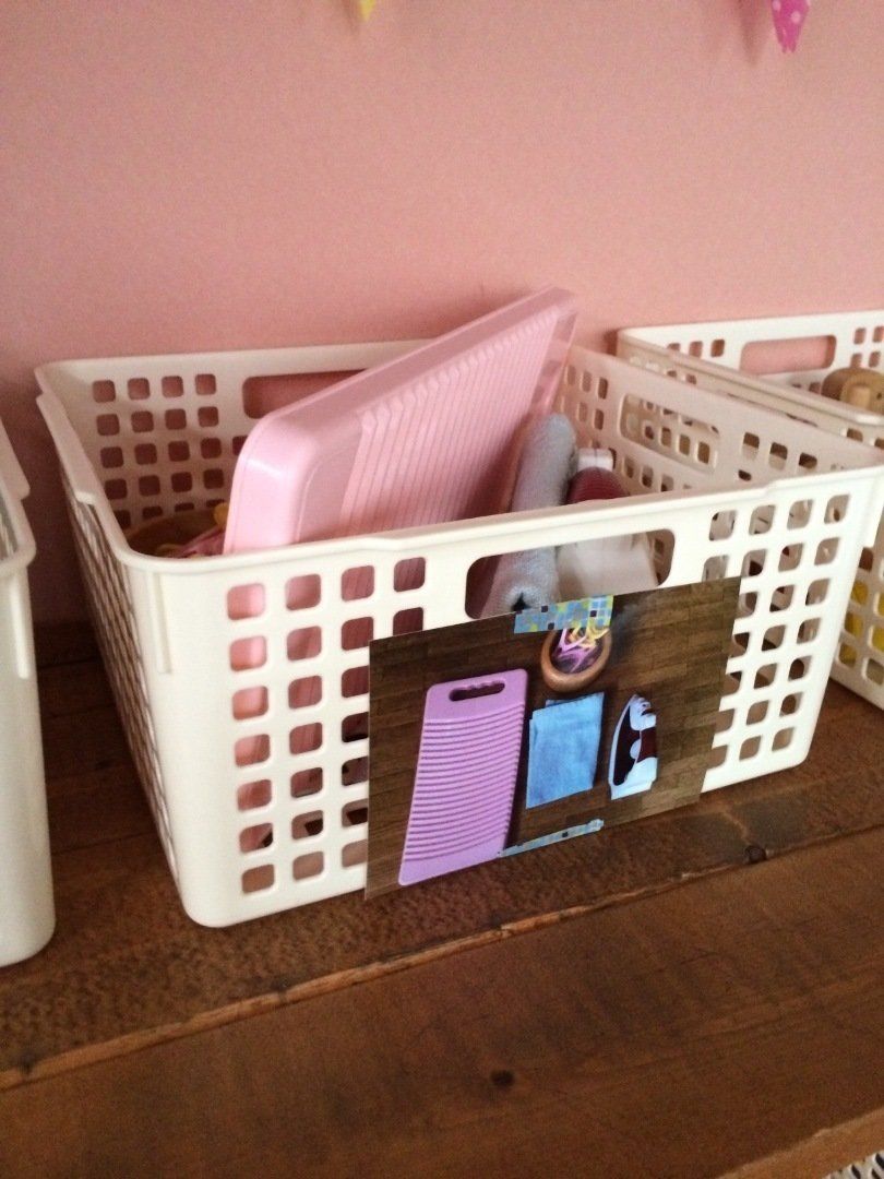 子どもの「片づけできた!」を応援する仕掛けをつくっている暮人さん。かごの中に入れるおもちゃがすぐにわかるように、写真を張り付けているようです。こうすることで、子どもたちも写真をみながら簡単に片づけることができるのだとか。子どもでも扱いやすい軽いかごを使うのがおすすめだそうです。