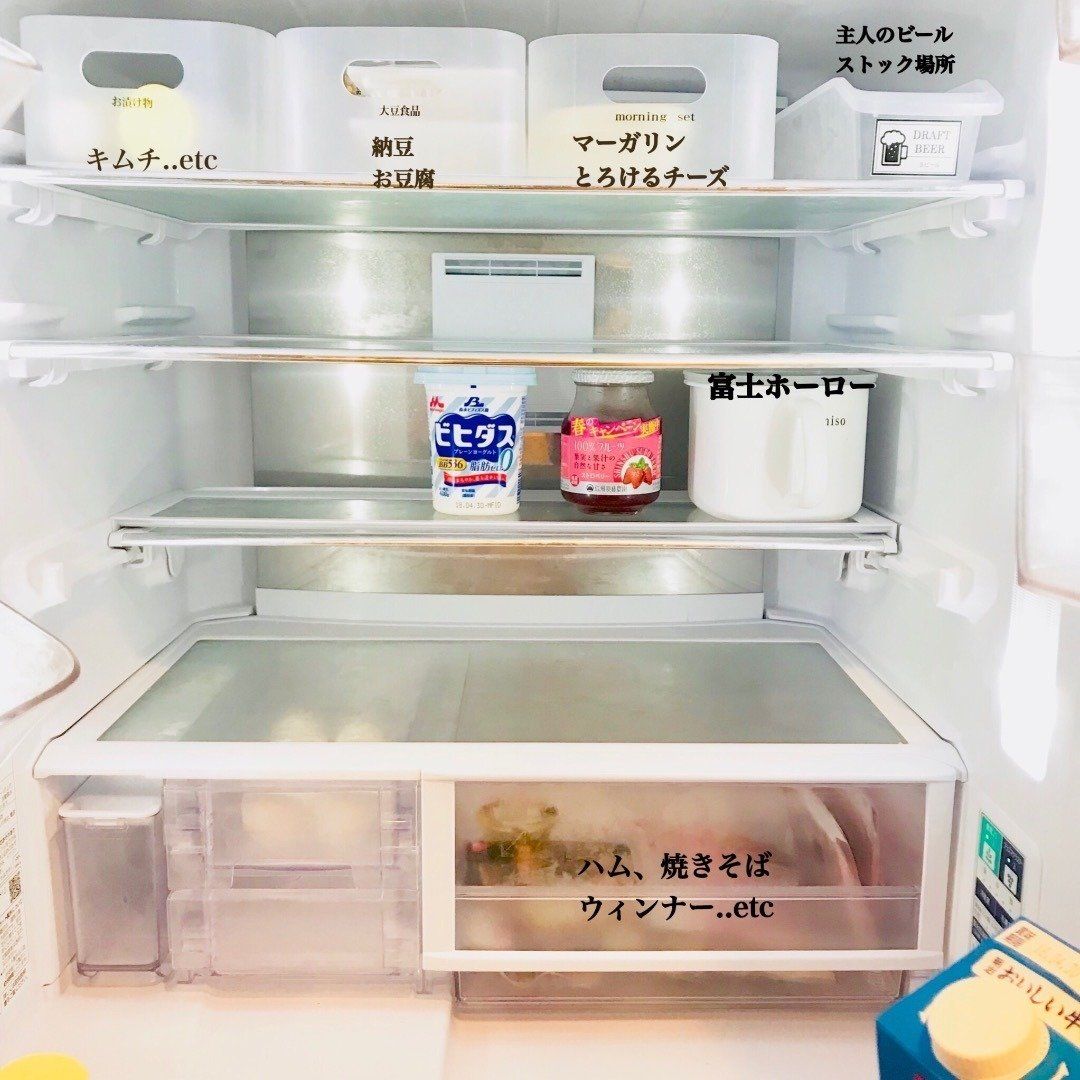 michiyoさんも、100円ショップの容器を冷蔵庫収納に活用しているようです。冷蔵庫の中身を種類別に分け、大きさをそろえたケースに収納することで、取り出しやすさがアップ。ケースは奥行きのあるものを選ぶと、スペースが有効活用できます。さらに、底に穴が開いているケースなら、掃除がしやすく時短にも◎。