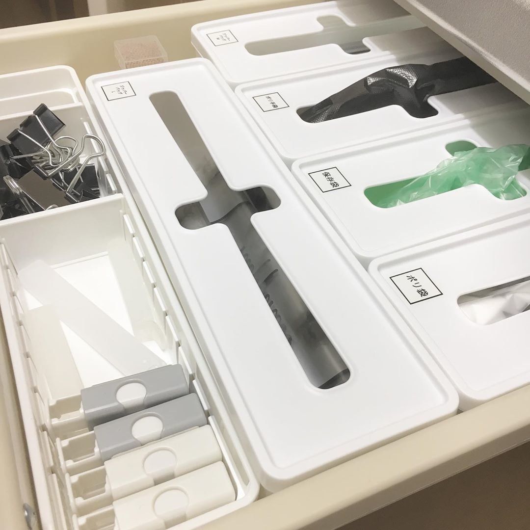 キッチンの引き出し収納の見直しで、ビニール袋やクリップなどよく使うアイテムを100均グッズで収納。引き出し内でズレるのを防ぐため、すき間にプラスチック製の段ボールを置きストッパーにする工夫がナイスです!