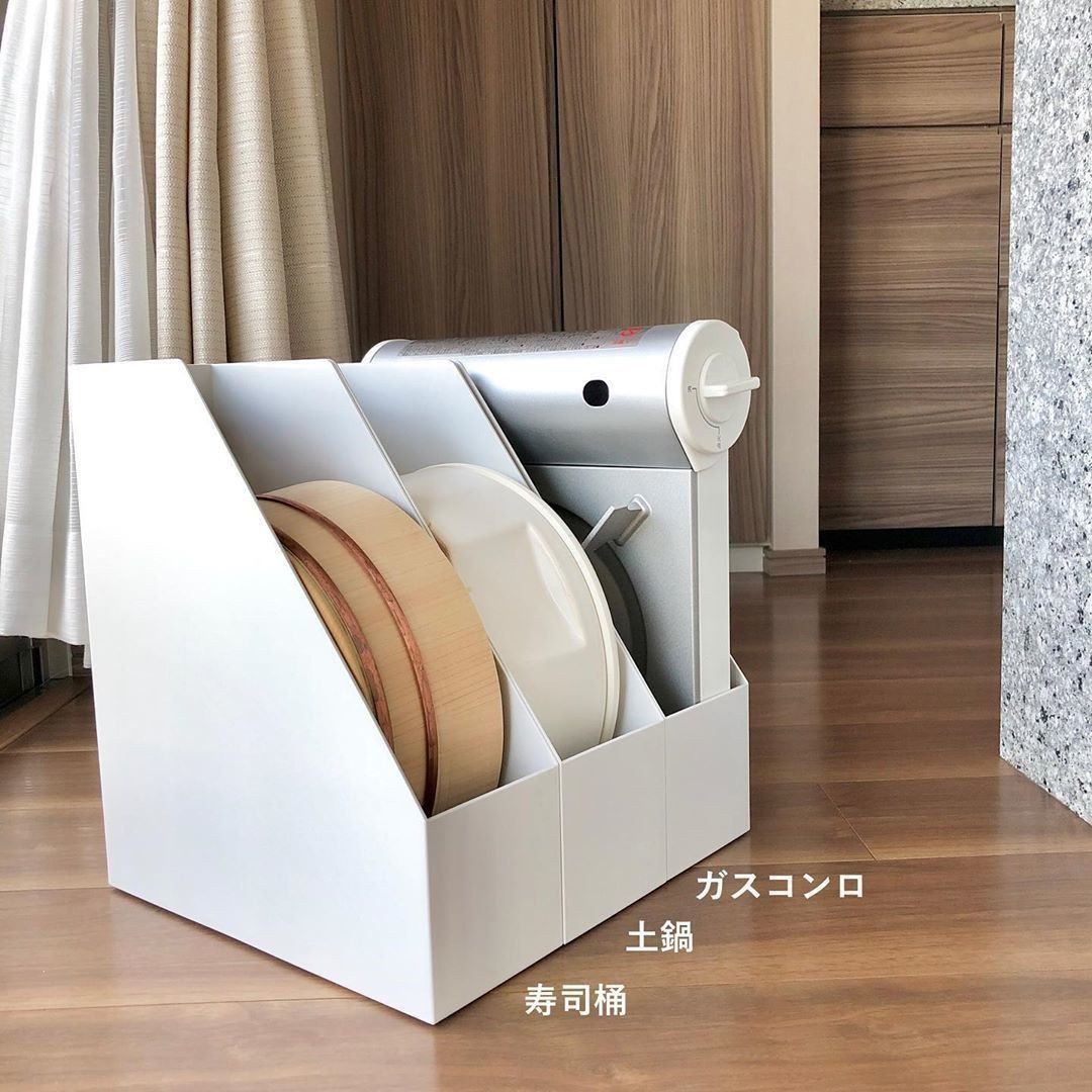 pote.pote.poteさんは、かさばる調理器具たちをファイルボックスに入れ、立てて収納しています。これらのファイルボックスは、背を正面にした状態で棚に入れることもできます。これならば棚をあけたときに見えても、すっきり!ぜひ、まねしたいアイディアですね。