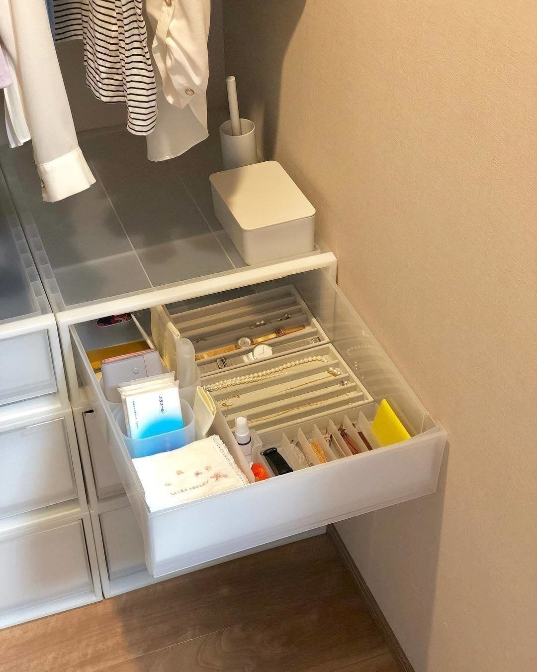 pote.pote.poteさんのクローゼットには、身支度をにかかわるものがきれいに収納されたコーナーが。今までは、小物類を引き出し上にならべていたそうですが、中に収納することにしました。使いやすくなり、開けるのが楽しみになったそうです。毎日のことだからこそ、テンションが上がる場所にしたいですね。