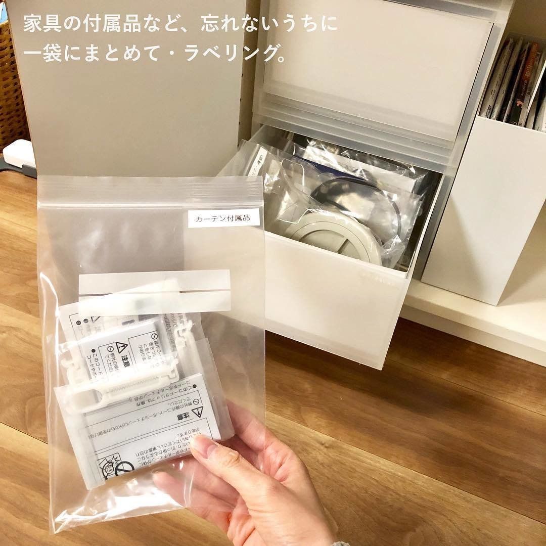 「これはなんの部品?なににつかうもの?」と困ってしまったことはありませんか?pote.pote.poteさんは、そんな用途不明なものをなくすため、ラべリング収納をおすすめしています。一式を袋にいれて、ラべリング。それだけで「なににつかうかわからないけれど、取っておこう」という、不要物の放置がなくなるそうです。
