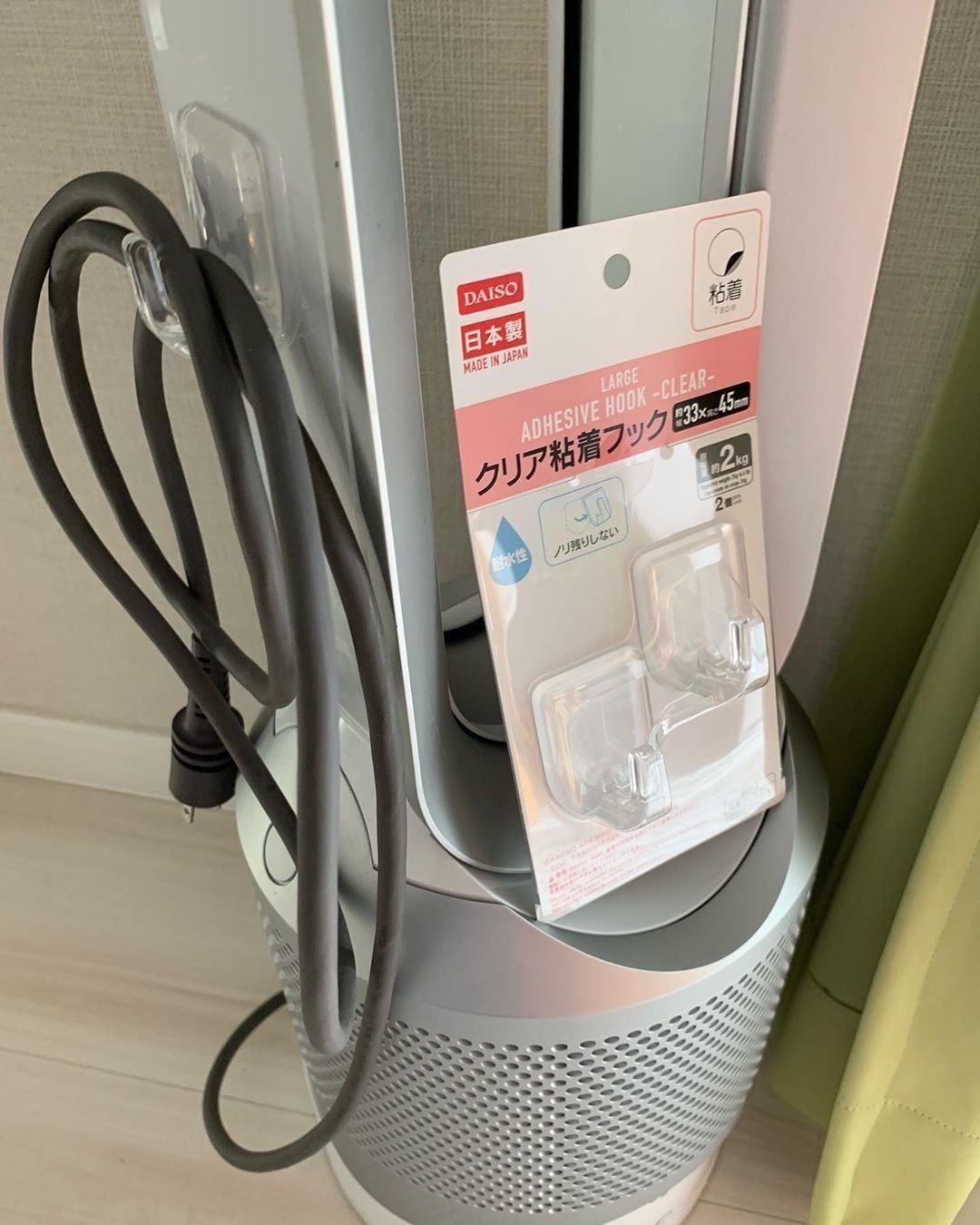 加湿器や空気洗浄機などのコードの収納はどうしていますか?本体に収納する場所はなければ、コードが邪魔になってしまいますよね。minamimmmさんは100均のクリア粘着フックを使ってキレイにコードを収納しています。このフックは万能で、様々な場所で使えるのでオススメなのだそう。