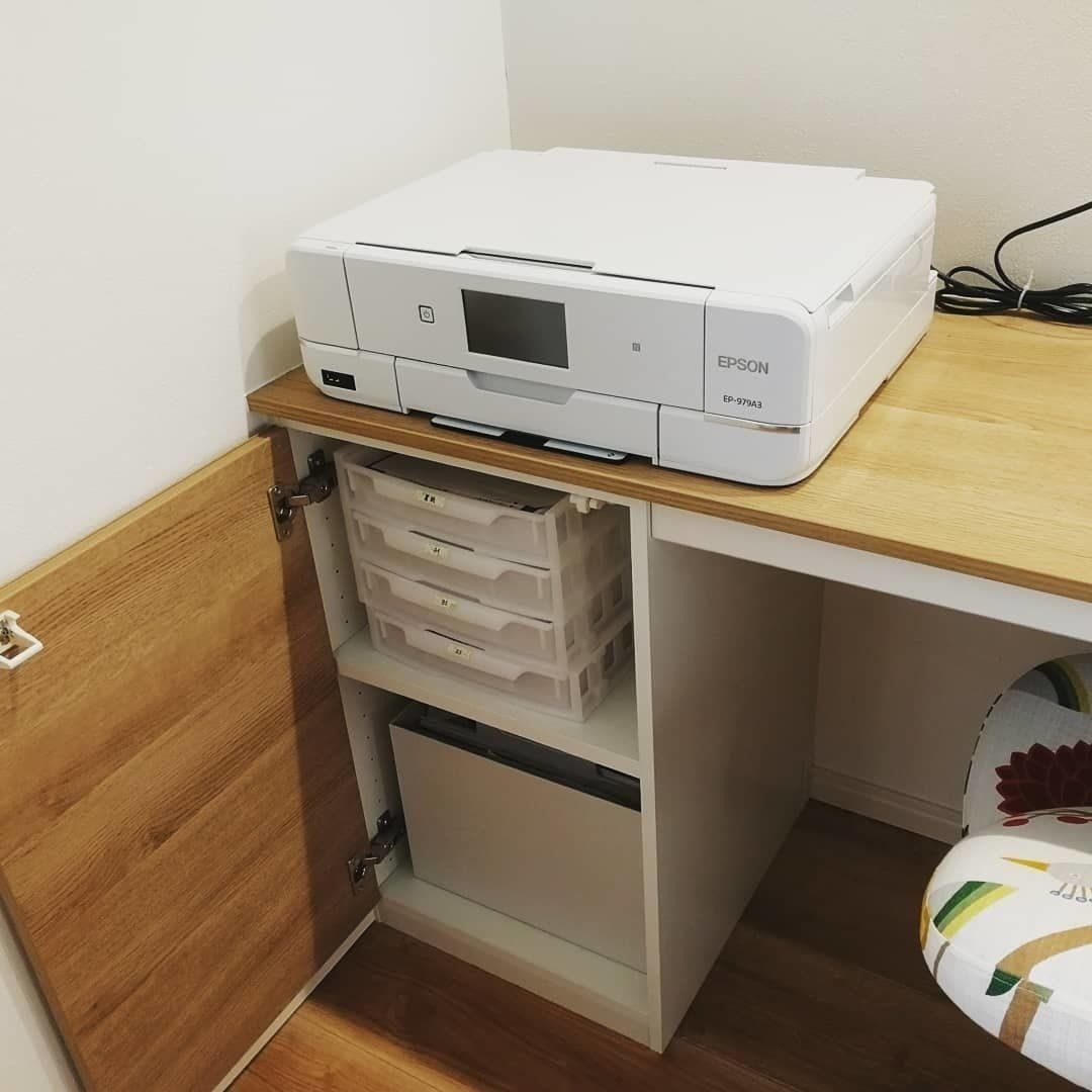 コピー機のコピー用紙の収納にダイソーのグッズを使用しているimmyu3さん。A4サイズのトレーとラックを積み重ねて、テプラでラベリングしています。コピー機のすぐ近くに収納することで、とても使いやすくなっているそうですよ。