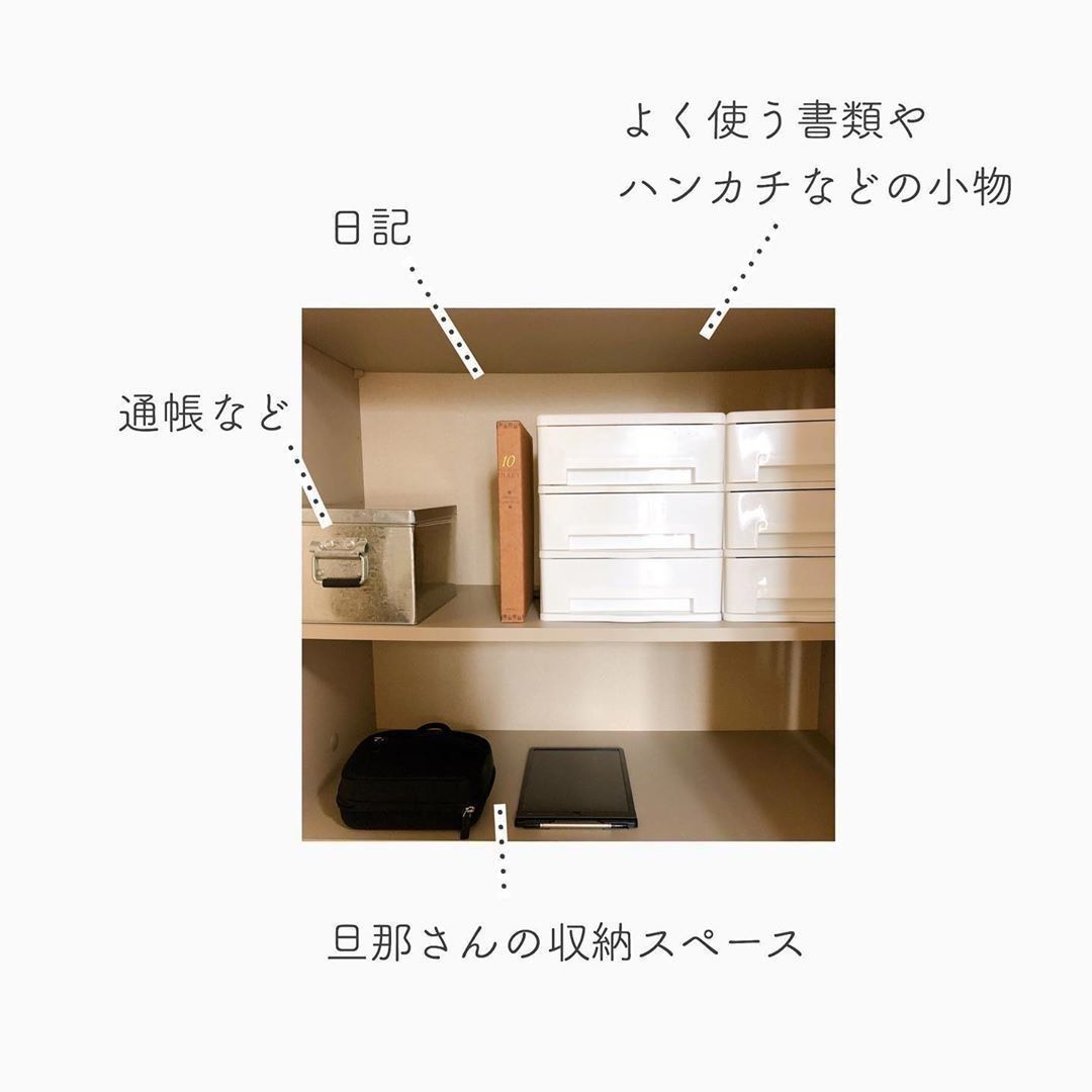 帰宅後にとりあえずものを置く場所をつくったthishouse_htさん。帰宅後ドタバタとしているとき、リビングなどがゴチャつくことはよくあること。そんなときに、仮置き場があるのは助かりますね。最終的に片づける場所へ移動させる習慣をつくることが大切なポイントのようです。