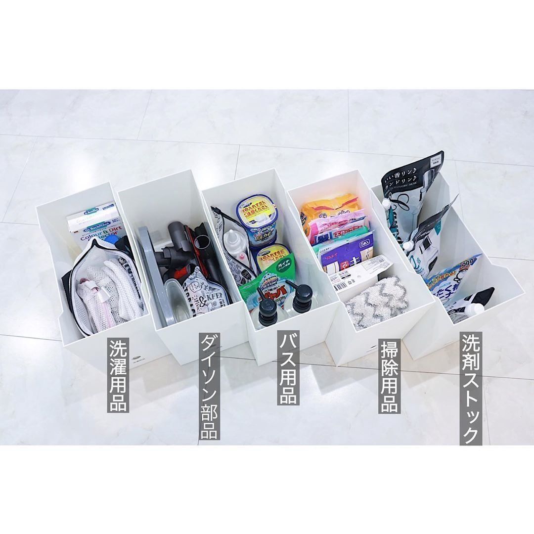 mari.s.homeさんは洗面所に、さまざまなストック類の収納場所を設けています。種類ごとにわけて白い収納ボックスに入れているので、色のごちゃつきが見えず、スッキリみえますね。また、よく使うものはすぐに取り出せるようにバラして入れたり、配置も考えてあるそう。整えられた空間は気持ちがいいですね。