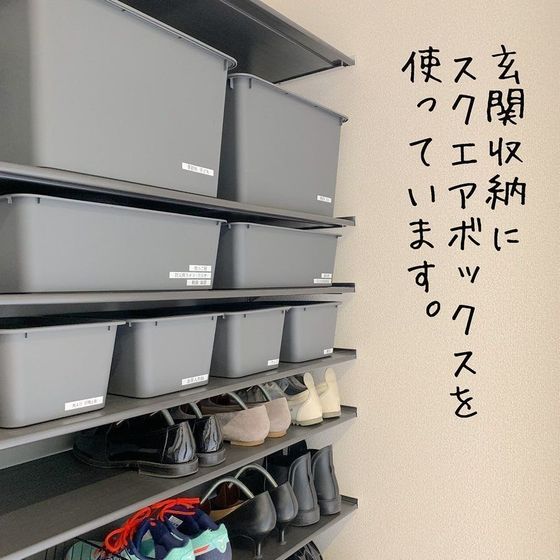 シューケア用品や虫よけグッズなどを下駄箱に入れている人も多いのではないでしょうか。靴以外のものは、ボックスを使って収納すると取り出しやすく、見た目もすっきりします。使っているのはダイソーのスクエアボックスです。