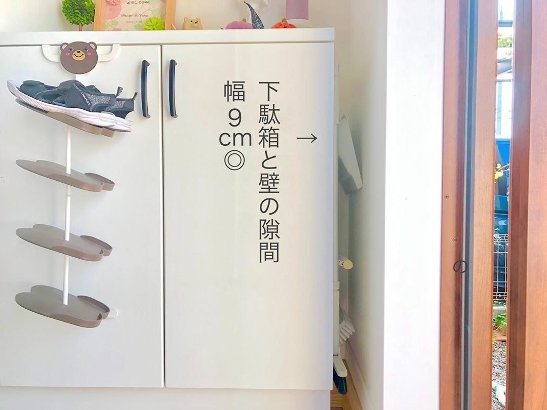 玄関掃除に使うデッキブラシやホウキ、ちり取り、スクイーズの収納スペースに困っていたarika_919さん。100円ショップでフックを購入し、下駄箱と壁の隙間に掃除グッズをまとめて収納することにしました。簡単に取り出せて、死角収納なので見た目も気にならないのがよいですね。