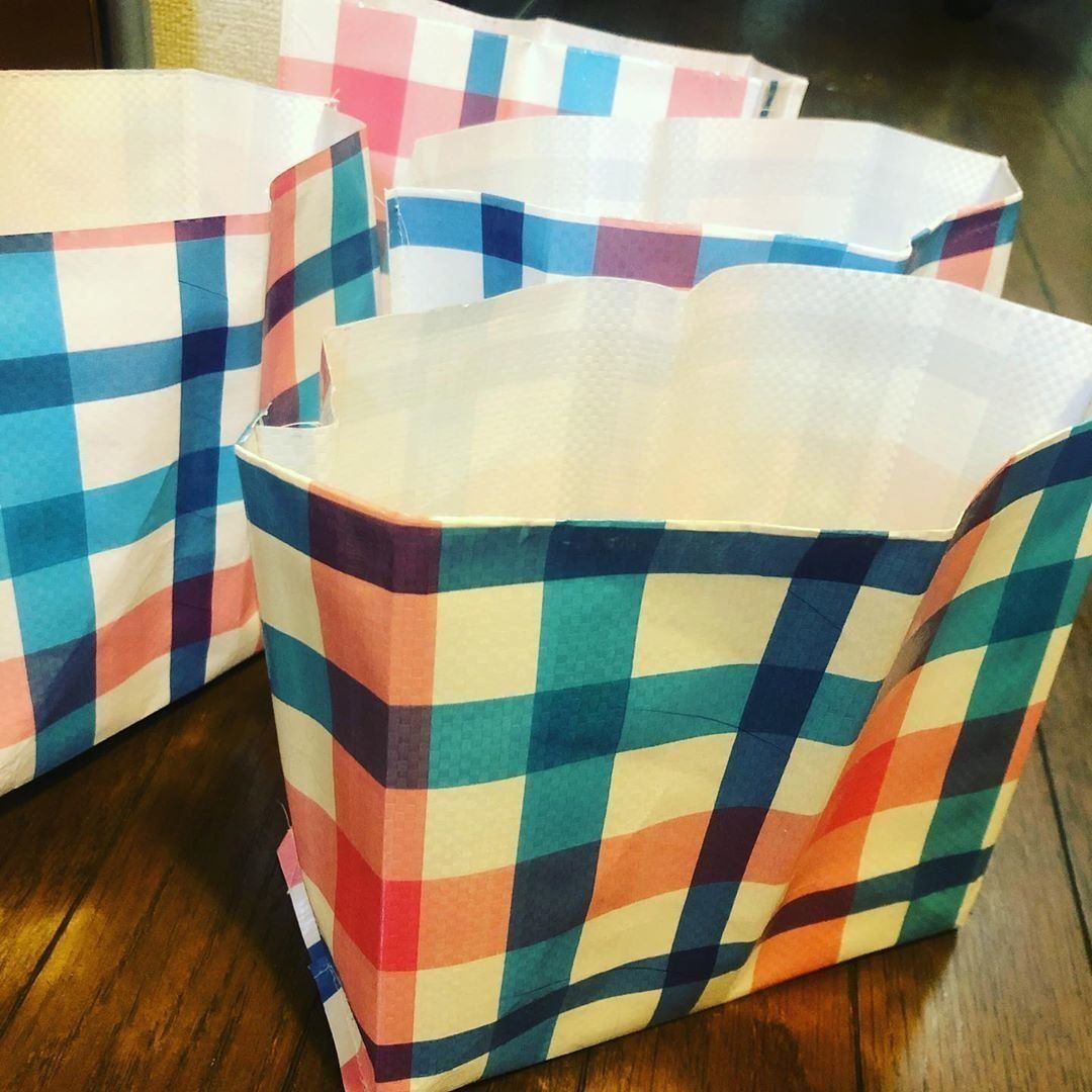 冷蔵庫の野菜室の収納に紙袋をつかっていたnanase.39.0469さん。壊れやすいので、100円ショップのレジャーシートをアレンジして収納袋を手づくり!両端は切りっぱなしのまま、袋状に縫い合わせてマチをつけたら完成です。汚れたら水洗いもできるので、とても便利なのだそう。