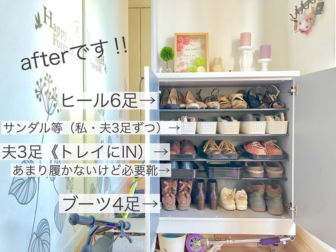 arika_919さんは100均のバスケットやシューズボックス、つっぱり棒を活用し、靴箱収納を整えたようです。そのまま置くとかさばる靴はバスケットに、夫の靴はシューズボックスに入れ片づけやすくしたのだとか。ヒールは前後ずらして収納し収納数を増やすなど、細かな工夫も施したようです。