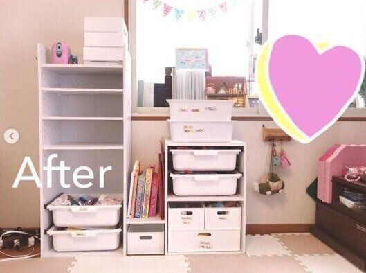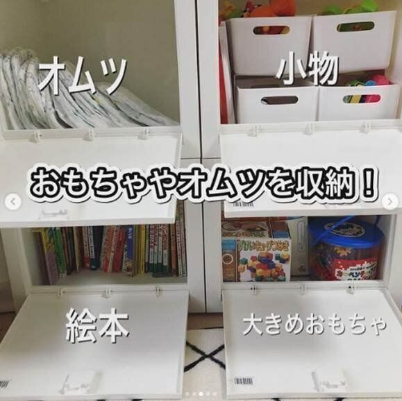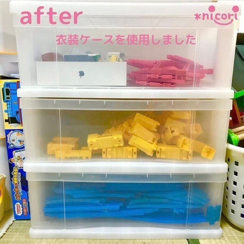 こちらはニトリの3段ボックスを横向きにして、2つ重ねておもちゃ収納をつくった例です。見える本が増えて取り出しやすくなったそう。子どもが使いやすい収納は、子どもも自分で取りだしたりお片づけができるのでよいですね。