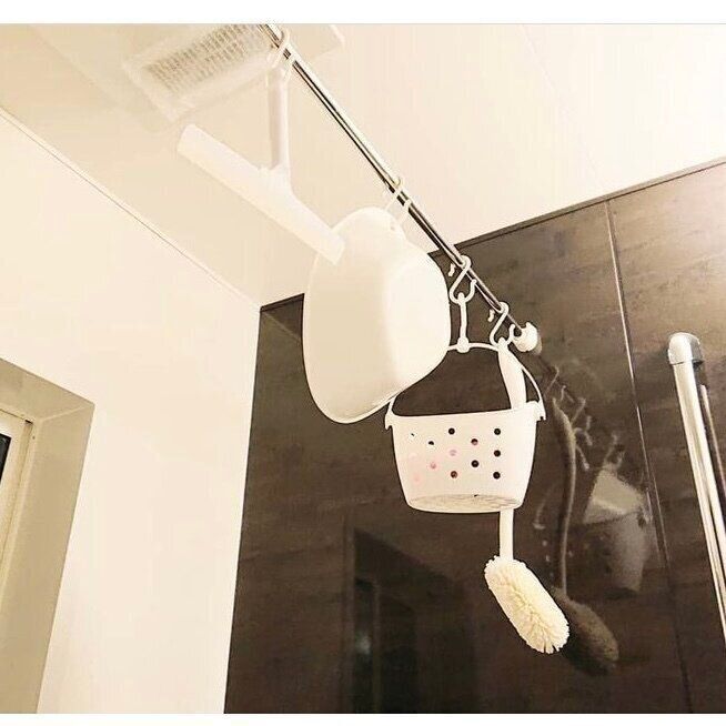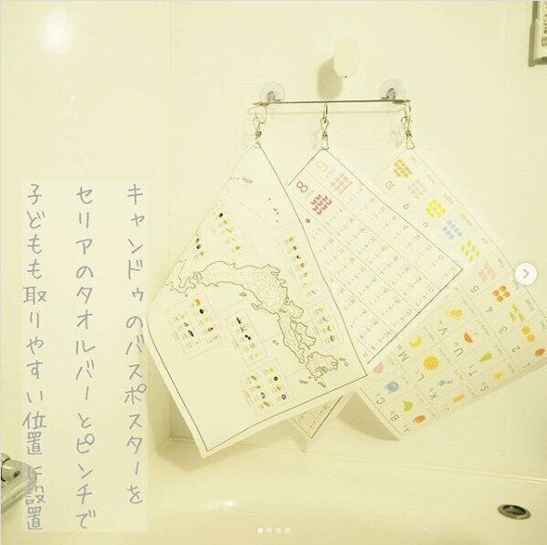 セリアのタオルバーとピンチを使えば、お風呂場に便利なバスポスターフックをつくることができます。これならたくさんのバスポスターを収納できるだけでなく、壁に密着しないので水切れもよくカビ予防にもなります。