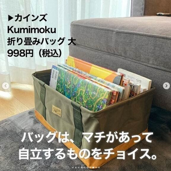 図書館から借りた本の置き場所って困りませんか?本棚に入れてしまうと子どもの本と混ざってしまうし…。こちらは「折り畳みバッグ」に入れてリビングに置いておくというアイデア。マチがあって自立するバッグなのでたくさんの本も余裕で入ります。持ち手がついているので、このまま図書館へGO!これは便利ですね。