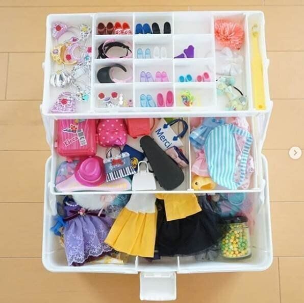 洋服や小物など、かわいいからとついつい集めてしまうリカちゃんグッズ。こちらは、救急箱を活用して収納しています。こまかい仕切りがあるので、小物も仕分けやすく、また遊びたい場所にどこにでも持って行けるアイデア収納。子どもにとっては、まるで宝箱ですね!