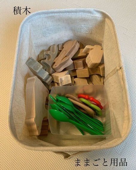 ニトリのNインボックスを活用しておもちゃ収納をしている例です。カラーボックスの中に入ったNインボックスには、園でつくってきたおもちゃや線路のおもちゃなどが入っているそう。こまかいものも収納できて便利ですね。
