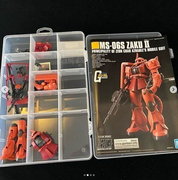ダイソーで人気のセクションケース。さまざまな小物収納に大活躍してくれますが、こちらはガンプラの収納に活用しました。このセクションケースのポイントは、仕切り板が1枚ずつ外せて好きな大きさに調整できること。大きさがバラバラのパーツの仕分け収納にまさに最適です!150円商品です。