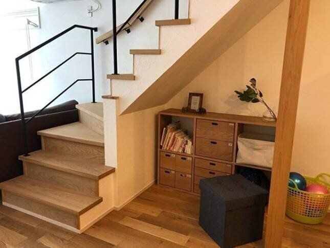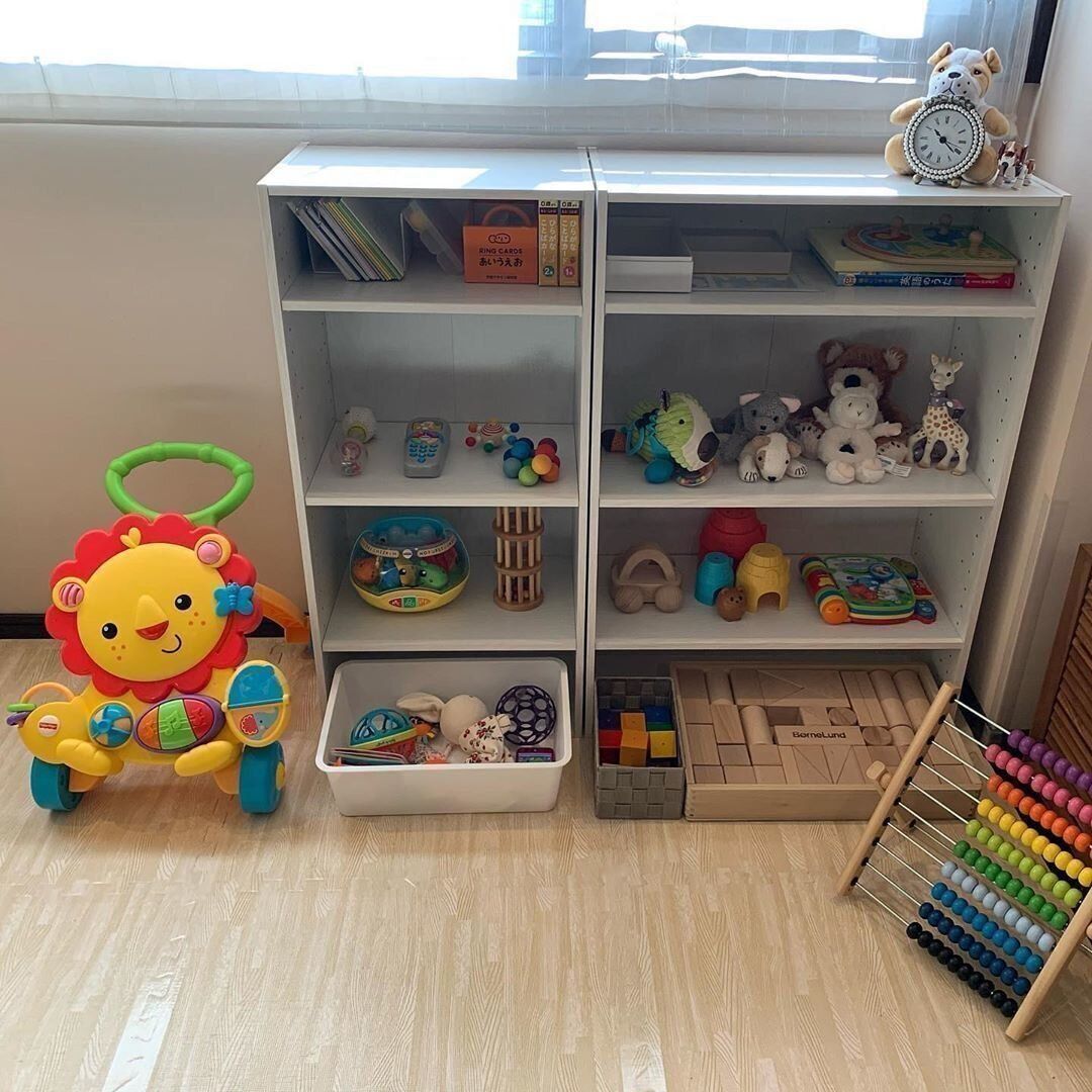 あえてカゴやケースに入れないことで、見やすさと取り出しやすさを重視した収納術。生活感の出やすいおもちゃは隠したいと思いがちですが、逆に数を厳選し出して収納することで子どもも遊びやすく片づけやすくなります。使わないおもちゃはまとめて収納しておき、ときどき入れ替えてあげることで、飽きもこずきれいな状態を保つことができるアイデアです。