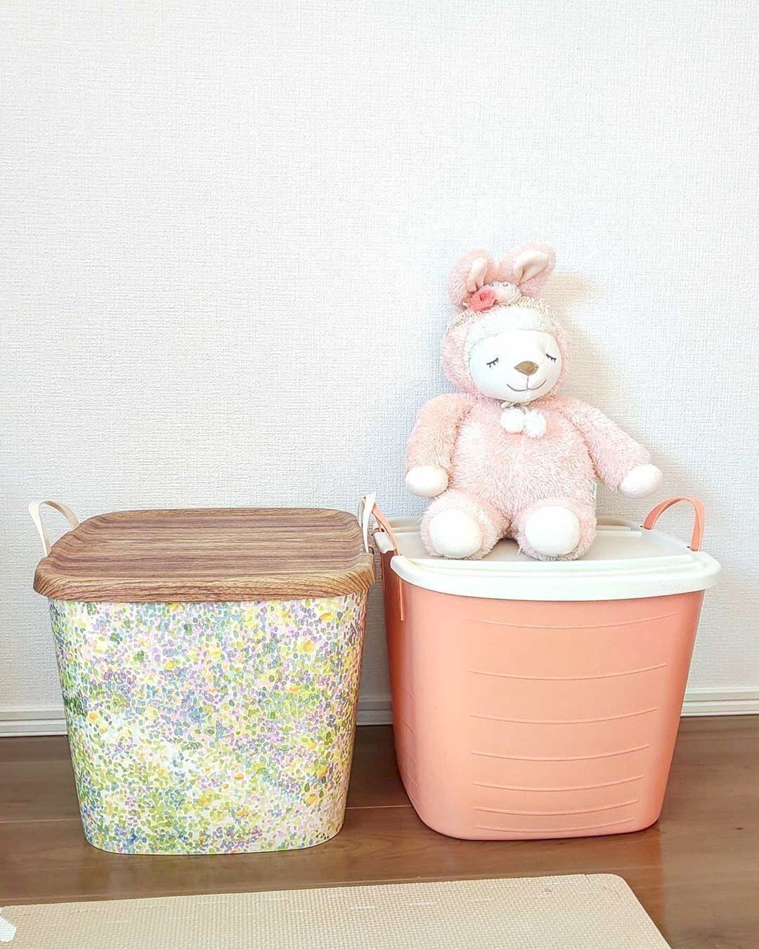 フランス生まれのおしゃれなボックスを使ったおもちゃ収納です。ふたはテーブル代わりに使うこともできるのだそう。おもちゃのポイポイ収納におすすめです。