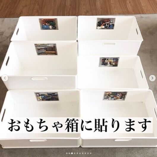 このおもちゃ収納、じつは子どもが遊びながら片づけられる工夫がされているんです。それぞれのボックスに入っているおもちゃの写真を撮り、ボックスの内側へ貼りつけます。