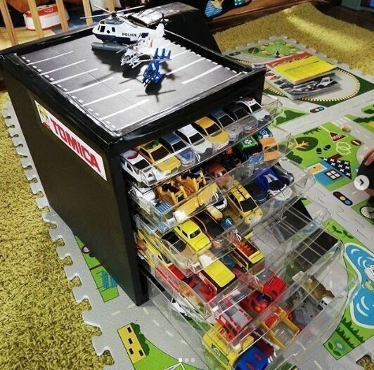 どんどん溜まっていくミニカー。どのように収納していますか?パーキングケースという専用の収納ケースもありますが、こちらはA4レターケースを使って上手に収納している例です。立体駐車場に見立て、屋上にはヘリが停まっているのがよいですね。
