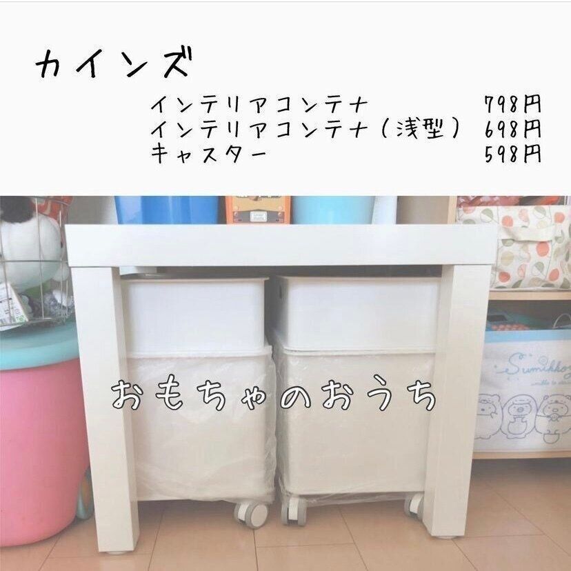カラーボックスの引き出しにも便利な「インテリアコンテナ」。このコンテナにキャスターをつければ、どこにでも移動ができるおもちゃ収納が完成です。