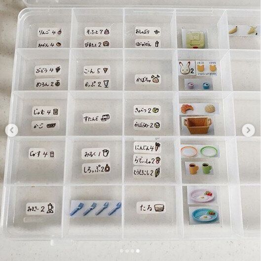 紛失しやすいこまかなおもちゃは、セリアの仕切りケースに「入れるものの名前+個数」をラベリング。しまう場所を決めておくことで、何が何個ないのかも一目瞭然です。イラストやシールをつけると絵合わせ感覚で楽しみながらお片づけができそうですね。