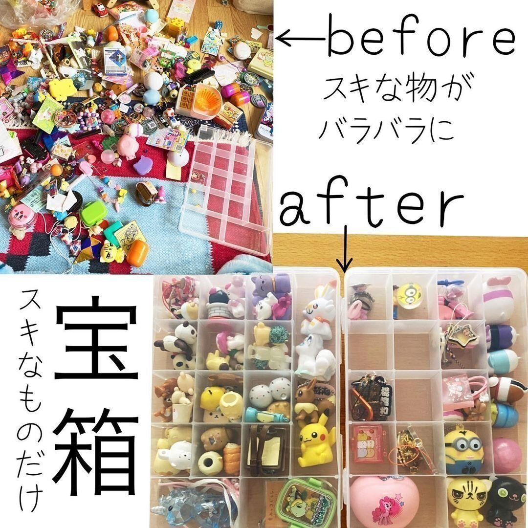 すぐになくなってしまいそうな小物の収納は、仕切りつきのボックスがおすすめ。「どこに行った?」と探す手間が省けるだけではなく、コレクションにもなり子どもも気分があがります。