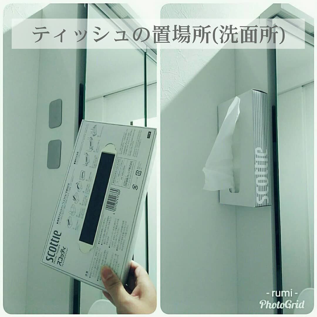 ティッシュボックスの収納は、マグネットを使ったくっつき収納を取り入れているrumi_home169さん。洗面所などマグネットがつかない場所は、100均で売っているマグネット補助板を貼ってくっつくようにしてあげるといいんだそう。省スペースに貼りつけられるのですっきりして見えますね。