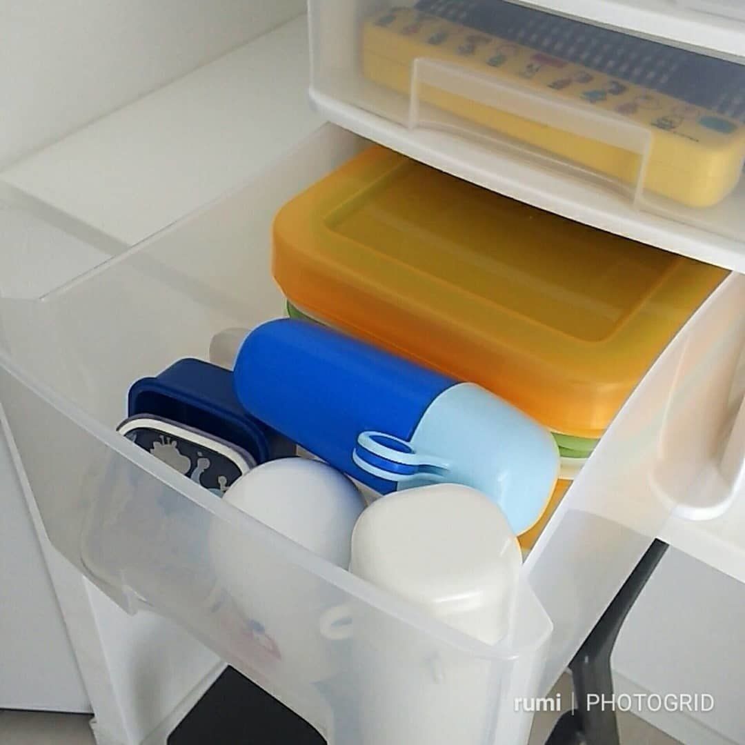 お弁当箱や水筒、バッグなど意外とごちゃごちゃしがちなお弁当グッズ。rumi_home169さんが実践しているのは、同じものをひとまとめにするグルーピング収納。アイリスオーヤマのレターケースに、長男は一段目、末っ子は二段目など分けて入れることで、見やすくすっきりと収められそうですね。