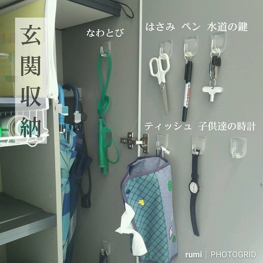 意外と難しい玄関収納。rumi_home169さんは、はさみやペン、水道の鍵、子どもの使うなわとびなど玄関にあると便利なものは、フックにかけて収納しているんだとか。荷物の開封やおろしたての靴や傘への名前書きなど、使うシーンを考えると必要なものがわかるはず。かけて収納することですっきり見えるのもいいですね。