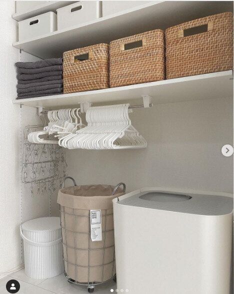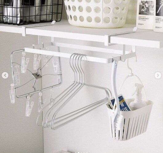 洗面所などの棚板に差し込むだけで設置できるハンガー収納。ハンガー自体の収納にも、服の収納や部屋干しの場所としても使うことができそうですね。