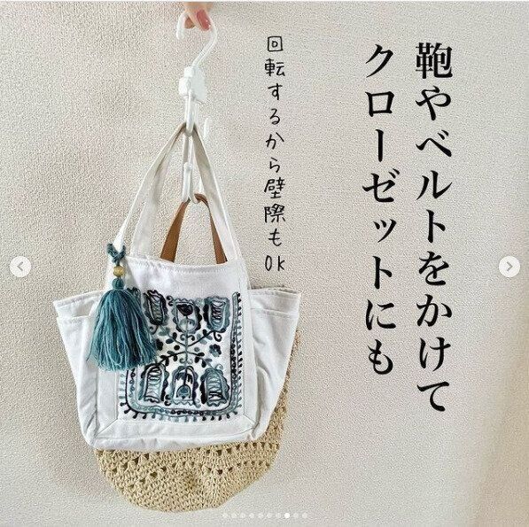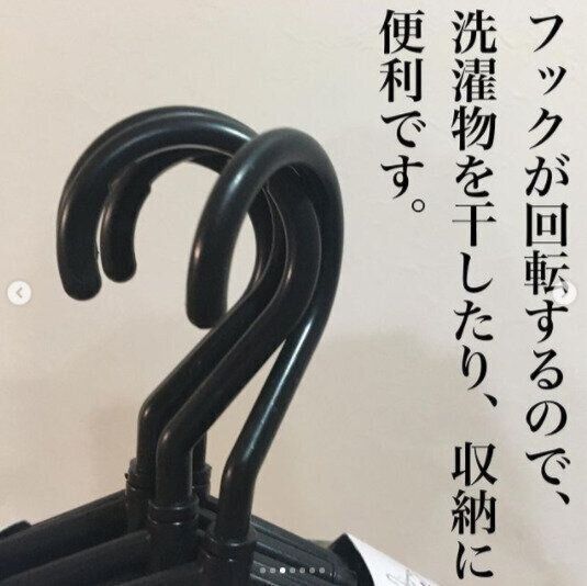 こちらはダイソーのフックが回転するハンガー。もちろん、洗濯物を干したりするときにも使うことができます。毎回ハンガーの向きを考えて服をかける必要がないのが便利そうですね。
