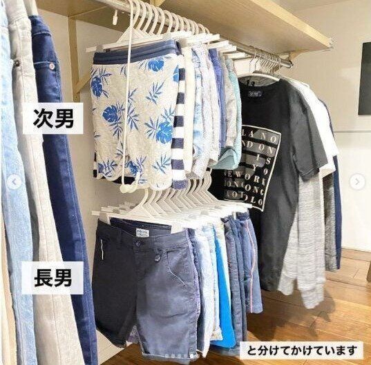 短パンは短いので、ハンガーを2段にしてかければ収納力もアップ。使うのはエス字のロングフックとつっぱり棒。どちらも100均で手に入れることができるので、安く簡単にすませることができます。