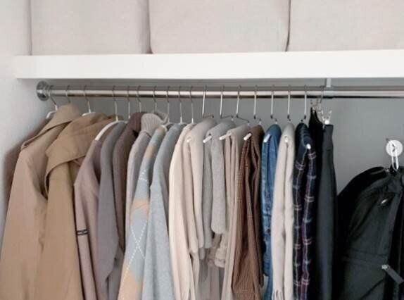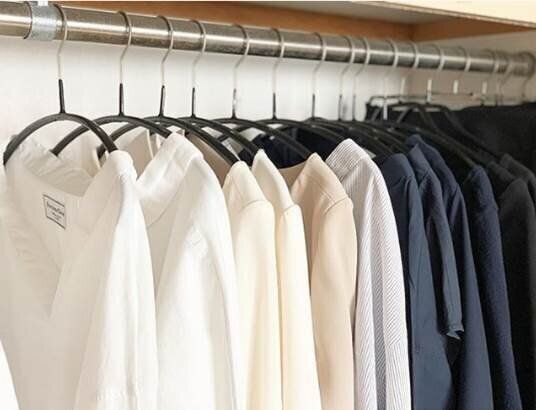 かけるだけで便利なハンガー収納も、かけ方を決めることで見た目もきれいになります。たとえば、カテゴリーごとに分ける、色ごとに分ける、などを取り入れると、見た目もすっきりしますよ。