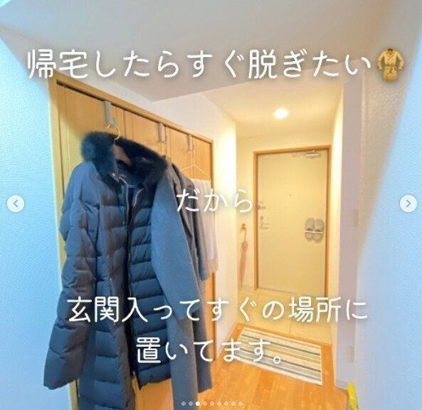 寒い時期は毎日外に出るときに着るアウター。毎回クローゼットにしまうよりも、玄関先にかけてしまうのが便利。セリアのドアハンガーを玄関収納に設置し、コート置き場をつくれば、出かけるときにさっと着ることができます。