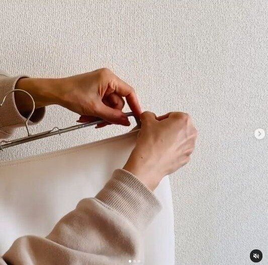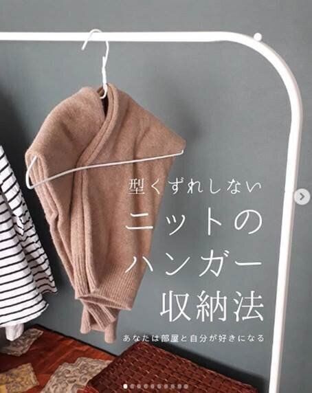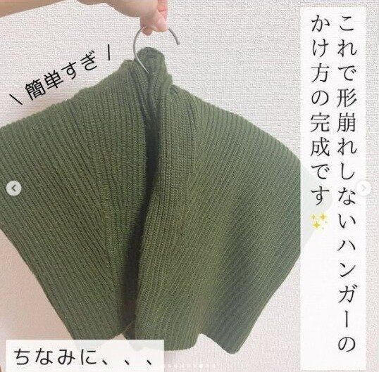 ハンガーにかけてしまうと、肩の部分が伸びてしまうニット。でも、形くずれしないハンガーのかけ方もあります。かさばるニットがハンガーにかけられたら、クローゼットの中もすっきりしそうですね。