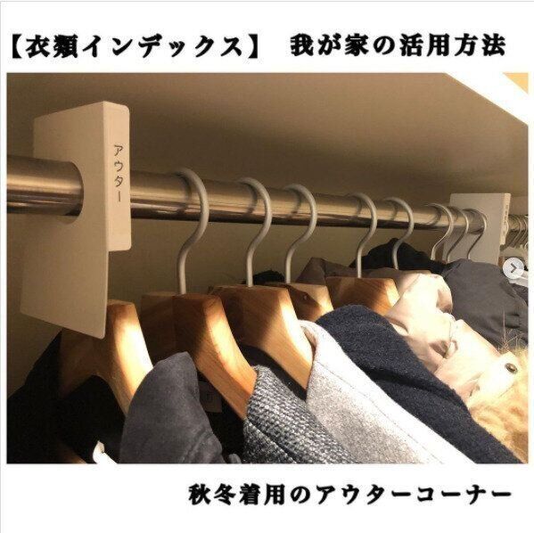 ハンガーポールにインデックスを取りつけることで、何がどこにあるのか一目でわかるようになるのできれいで長続きさせることができます。ファミリークロークに家族全員分の衣類を収納している人は家族ごとのインデックスをつくれば、どこにだれの衣類がかけてあるかもわかるようになります。