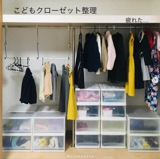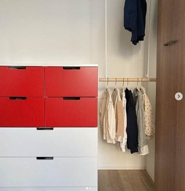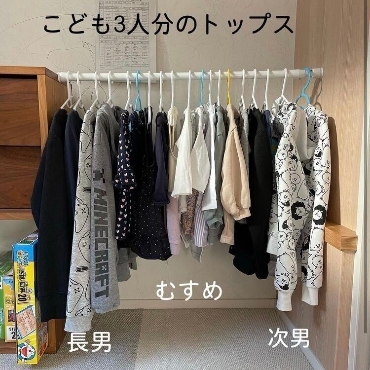 こちらに子ども3人分の洋服がすべて収納されています。収納量を増やすために、下段に2本のつっぱり棒をつけました。短い子ども服だからこそできるアイデアですね!小さな子どもにも手が届きやすく、また洋服の衣替えも上段と下段を入れ替えるだけで、とっても簡単です!
