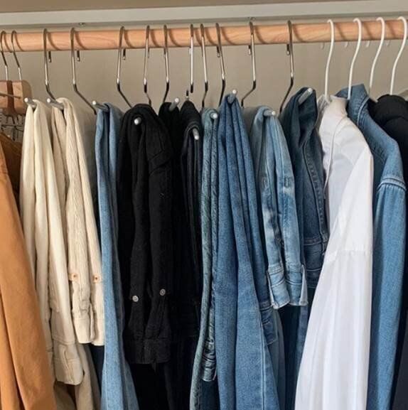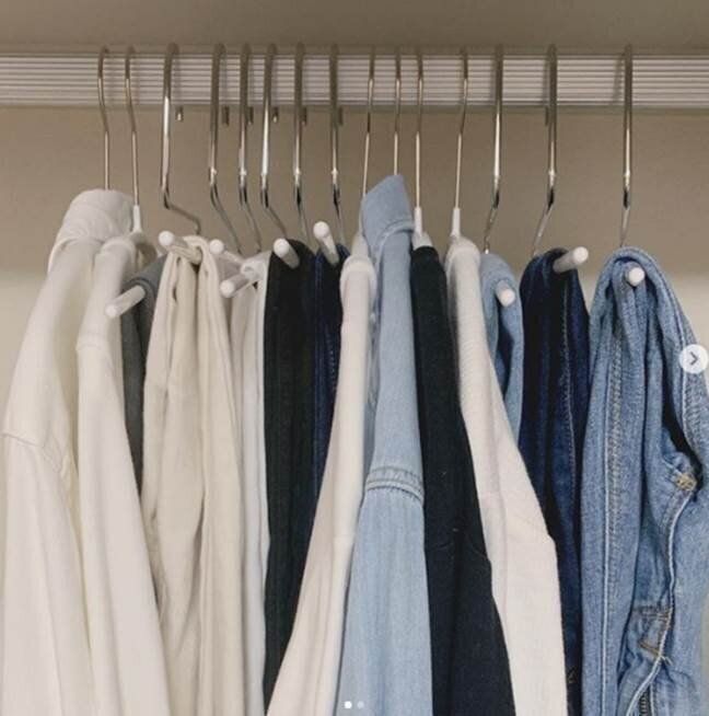 こちらのため息が出るような美しいクローゼット。持っている洋服をグラデーションで並べることで、見た目にもすっきり。自分が持っている洋服の傾向もわかりますね。そして何より、ハンガーを統一することで美しさがアップ!何度も開けたくなるクローゼットです。